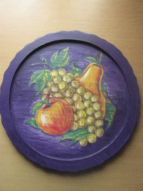 Не, поднос чудесный вышел. Мне очень нра! Фрукты обалденно красивые! Срисовывала или сама придумала? В любом случае, исполнение на 5+! А чем рисовала? Это масло?
