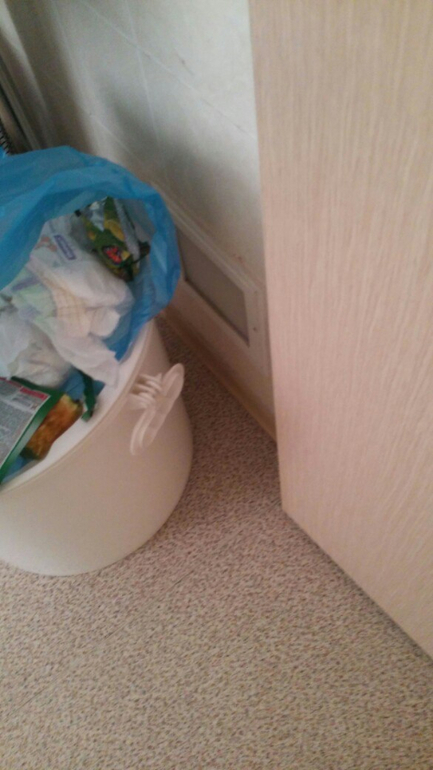 На фото слева квадратик на стене за ведром, похож на люк. На самом деле это ночник. Гениальнейшее изобретение, которое можно придумать. За ведром, раковиной и моей сумкой свет не раздражает и не будит, ибо расположен почти у пола, но при этом очень удобно менять подгуз ночью.