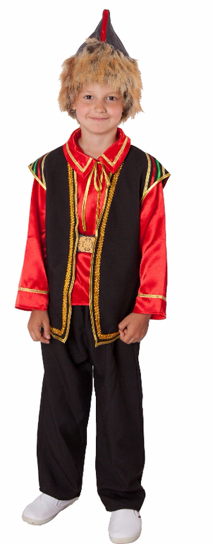 Ну костюм мальчика брать в аренду точно не нужно. 3 метра золотой тесьмы и 20см плотной черной ткани обойдутся в 150р. Воротник от куртки на поля шапки, обычная жилетка с приметанной тесьмой и рубашка с ремнем какая есть в наличии.