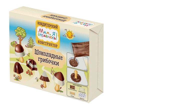 Знаю, что не все любят съедобные подарки (сама против них). Но если уж очень надо, то - имхо - лучше что-то интересное. Здесь в комплекте формочки для создания шляпок, пакет с белым и молочным шоколадом, ножки-печеньки. Т.е. мы топим шоколад, наливаем по формам, отправляем в морозилку. Через 10 минут собственноручно скондитеренные грибы готовы. Шоколад вкусный, сегодня оценили.