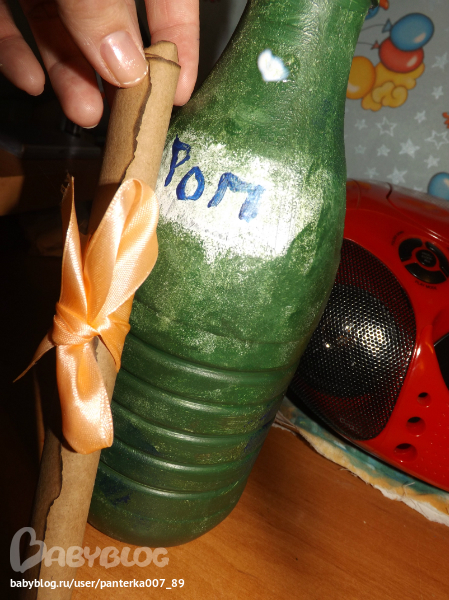 бюджет особо не позволяет купить шикарный подарок и по-этому сделала сама,вечером ванна с пенкой и арома,а в пенке муж нашел бутылку из будущего ,внутри моя записка лет через 25))))такое поздравление)))
