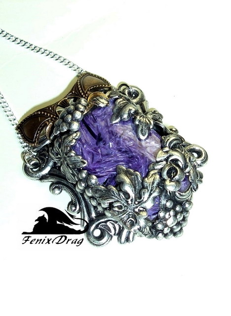 Кулон "Сиреневая сказка" с натуральным (сиреневым, фиолетовым камнем ) чароитом, стимпанк - элементами и гроздьями винограда
