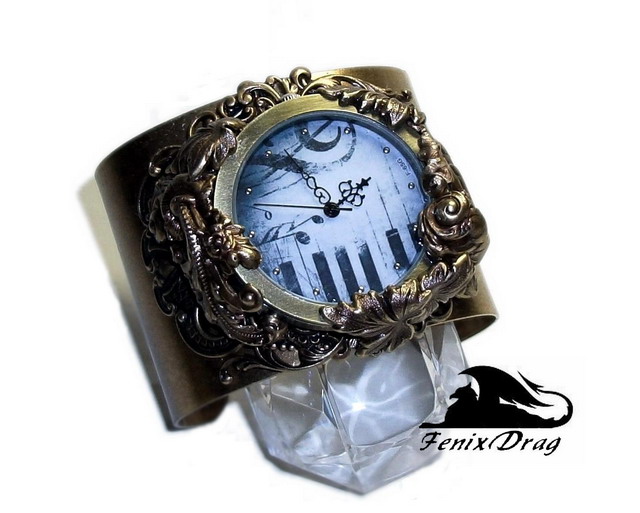 Широкий браслет "Звуки старого рояля" с часами с изображением пианино