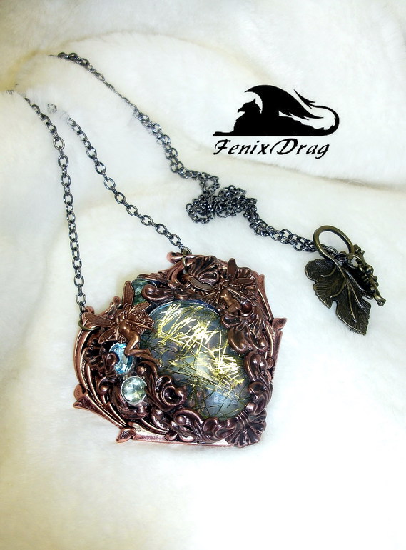 винтажная латунь в покрытии медью, золотой рутиловый кварц ("волосатик"), голубой кварц, зеленый кварц