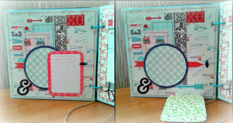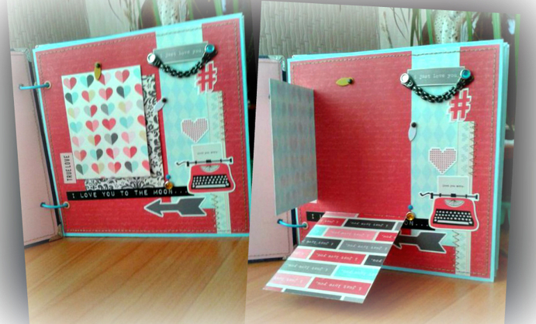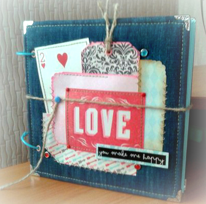 . 4 листа, мягкая джинсовая обложка, очень интересное оформление страничек. альбом размером 20х20. вмещает 35 фотографий разных размеров и 8 полей для записи пожеланий, признаний или просто коментарии к фото) отличный подарок любимому человеку на годовщину отношений или на день рождение. альбомчик стоит 2300.