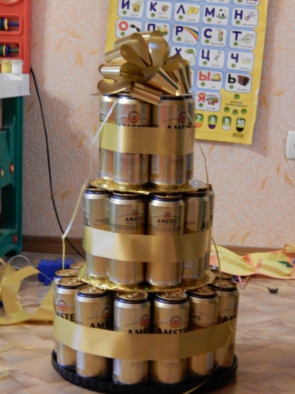 сюрпризы и подаркиМуж мой свое 33 летие отметил не с нами, а вдругом городе, скоро вернется домой и его ждет сюрприз, но что-то тортик из 33х банок пустоват...видимо из за одной золотой гаммы...что мне добавить или изменить, чтоб он смотрелся со вкусом? Внутри напиханы фисташки, сухарики и рыбка