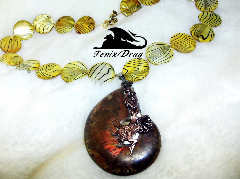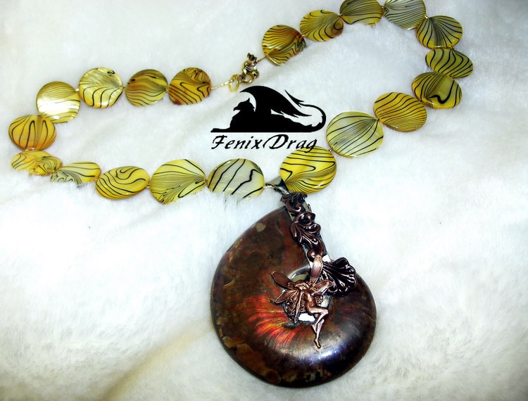 Колье "Волшебство лета" с аммолитом (аммонитом) и желтым перламутром в Морском стиле