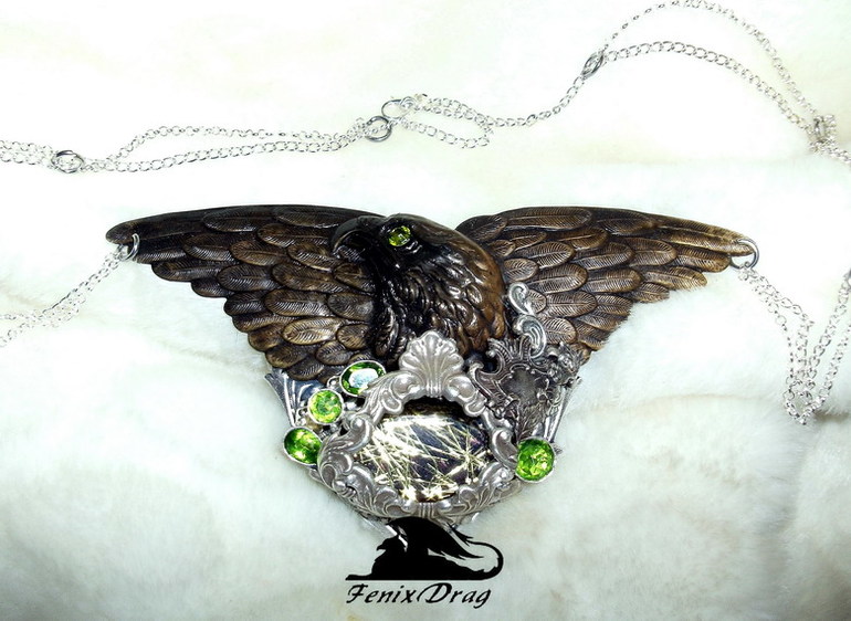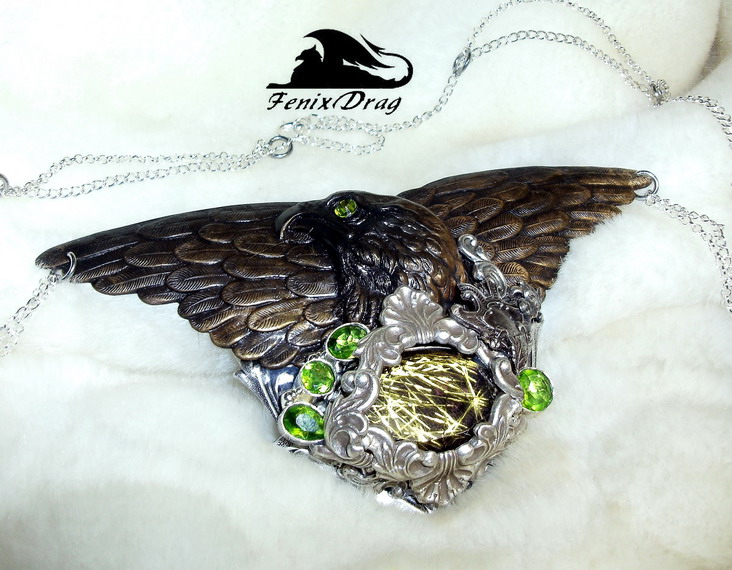 Колье / кулон "Ворон" с золотым рутиловым кварцем Стимпанк, Готика, Винтаж, Викторианский стиль