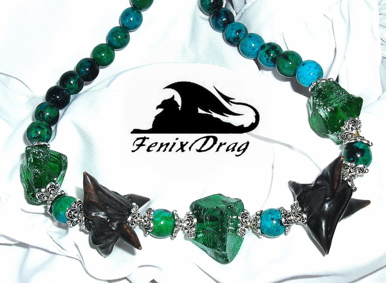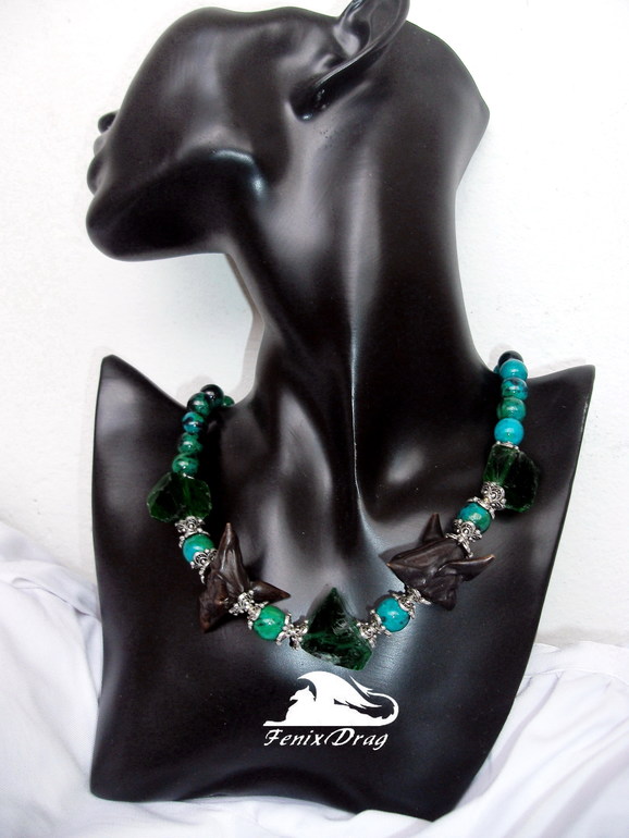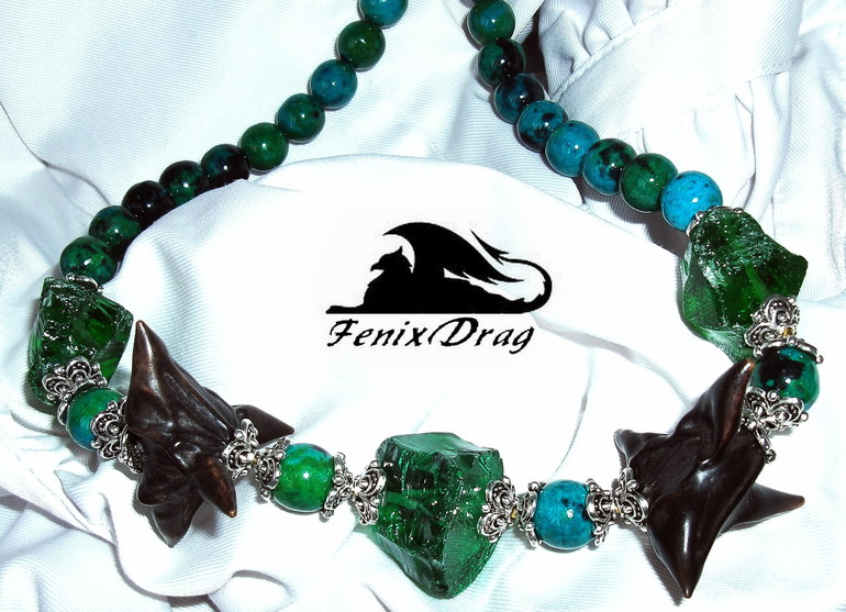 Колье "Чертоги леса" с хризоколлой, зеленым необработанным кварцем "лед" и чилимом ("водяной орех" / "чертов орех")