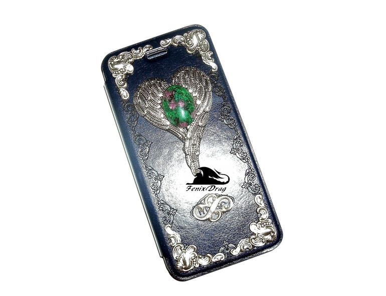 Кожаный винтажный синий чехол для iPhone 6 с рубиновым цоизитом в стиле Стимпанк / Steampunk ручная