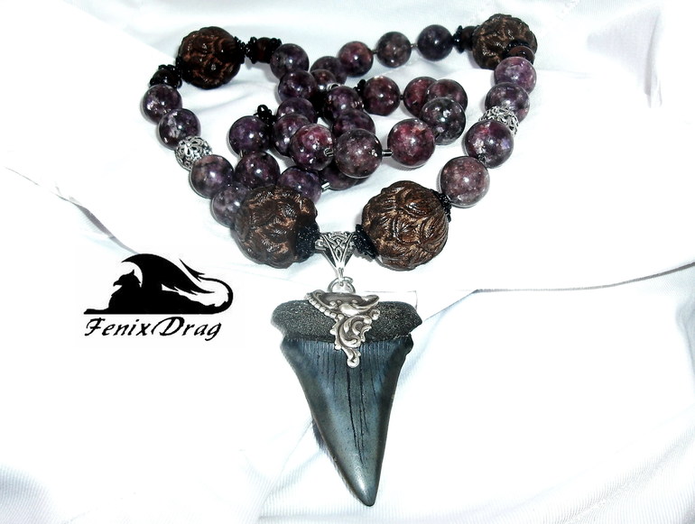 окаменелый зуб акулы Кархародон мегалодон (Carcharodon megalodon); кунцит (сподумен) (12 мм); резное сандалове дерево в виде бутонов лотоса; эбеновое дерево; винтажная латунь в покрытии серебром, металл