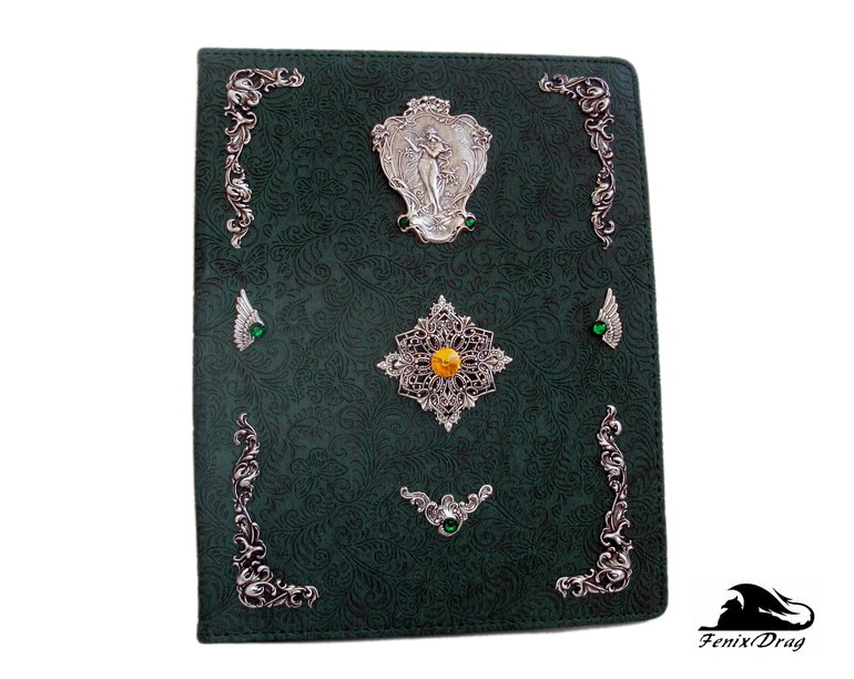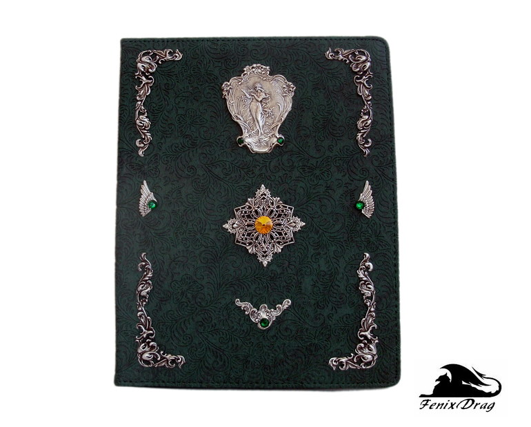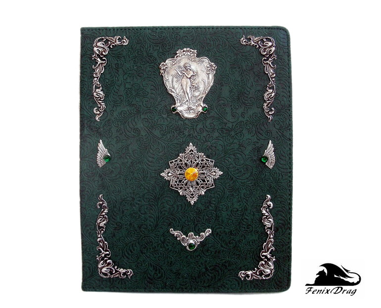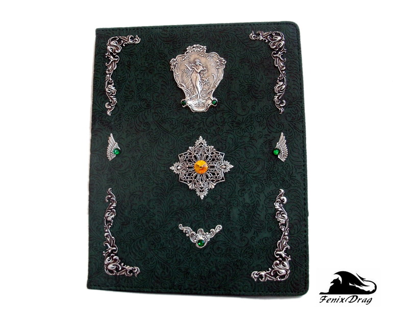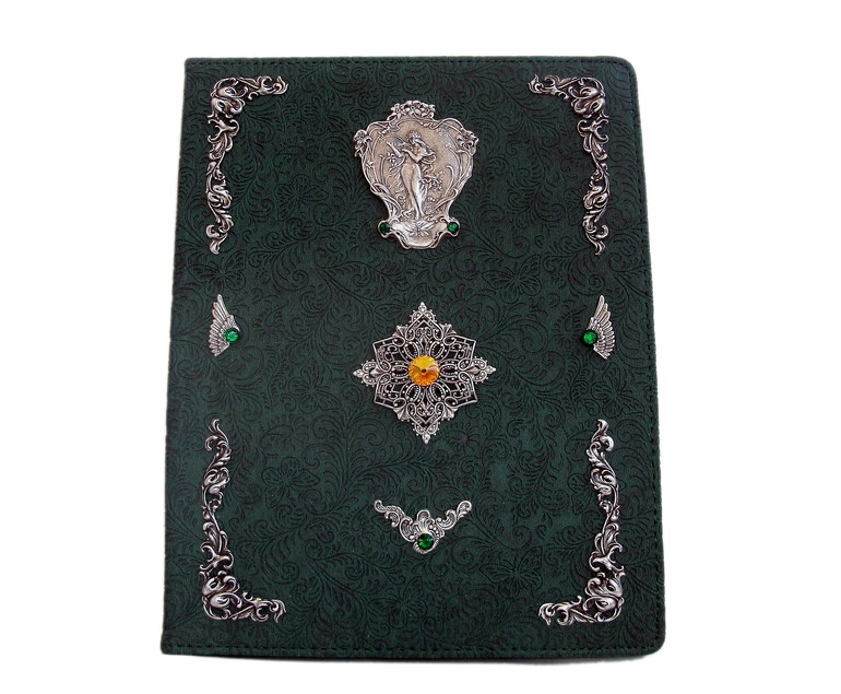 темно-зеленая искусственная кожа с узором (тиснение), латунь высокого качества в стойком покрытии серебром, риволи и стразы Сваровски