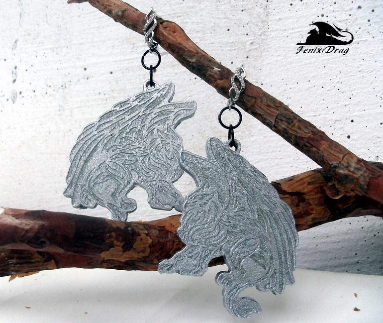 Серьги "След легенды" с образами грифонов из натурального дерева (береза) Фентази, Бохо стили