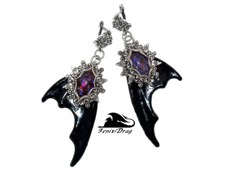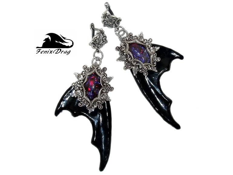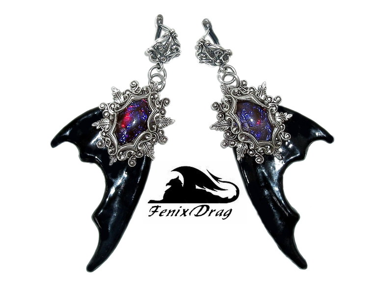 Черные серьги "Алисамбе" крылья дракона и темные искусственные опалы, в стилях Стимпанк, Готика и Ви