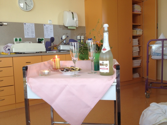 Это сразу после родов, я валяюсь еще непотребная. А моя чудесная акушерка ввозит вот такой вот столик. Говорит, я думала ваш муж придет и вы отпразднуете. Но т.к. муж придти так скоро не мог, то мы с ней выпили шампанского и конфетками закусили.