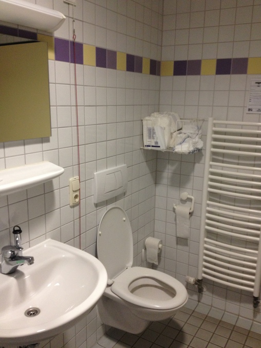 При каждом родзале есть свой санузел и ванна. До родов делали клизьму, хотя некоторые девочки, живущие в Германии говорили, что им не делали. Видимо это не повсеместно. Так вот, этот туалет и ванна были очень кстати. В туалете есть буквально все - прокладки всех мастей, одноразовые трусы, полотенца, гель для душа. На роды предложили мне больничную рубашку и это тоже было хорошо.