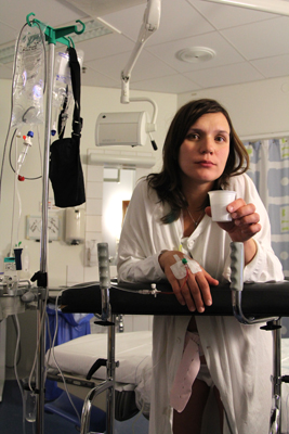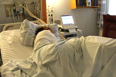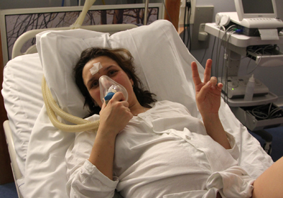 Итак, меня сразу подключили к КТГ и стали наблюдать за схватками - они все так же были нерегулярные, но сильные. Мы с мужем веселились и играли в «Бинго» - это когда схватка доходит до максимальной отметки - 100. :)) Через час мне стало уже не до веселья, и я начала скулить и просить обезболивание. Мне предложили иглоукалывание и «веселящий газ». Иголки не помогли, а вот газ хорошо пошел! Не могу сказать, что он обезболивал, но с ним было гораздо легче. Т.е. я всё ощущала в полной силе, но было настолько всё равно! )))
