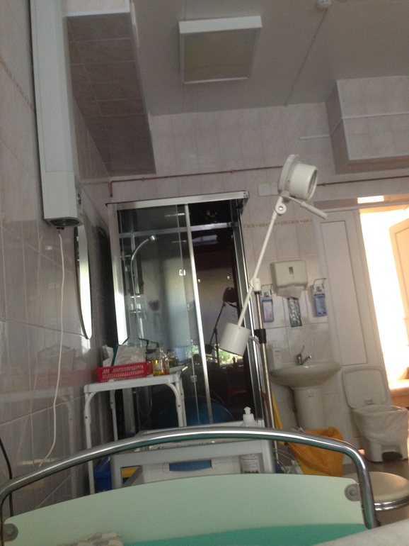В родильном отделении меня определили в отдельный бокс, (там таких штук 8). Эта комната в которой есть кровать, кровать на которой рожаешь, всякие штуки для ребенка, фитбол, душ кабина, пуфик и др