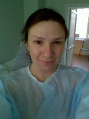 Дежурный врач посмотрела меня на кресле, пузырь оказался цел (!!). Но тест на подтекание вод казался положительным. Отправили ждать моего грузина (доктора). Он пришел около 9-ти. Посочувствовав соседкам моим, сказал мне, что я-то куда тороплюсь ))). В общем посмотрел на кресле меня, пришел второй врач, который непосредственно снимал кольцо, я ему сказала, что он вчера очень хорошо снял, так что у меня сегодня воды отходят...Посмеялись в общем. Врач решил колоть пузырь, так как он треснул, но где-то сверху...Время 9-45, прокололи. Процедура не болезненная. И сразу пришло осознание, что назад дороги уже нет. Далее шли подготовительный операции - клизма (я ее так боялась почему-то, но на деле все прошло более чем нормально))). Выдали мне операционную полупрозрачную рубашку, в которой я курсировала по коридору под завистливые взгляды остальных беременных. "Схватки" (это я так думала, что это они) были слабые и вполне терпимые. Я прокручивала в голове видео про дыхание, настрой был спокойный и решительный. Даже сделала фото в палате перед отправкой в родильное отделение: