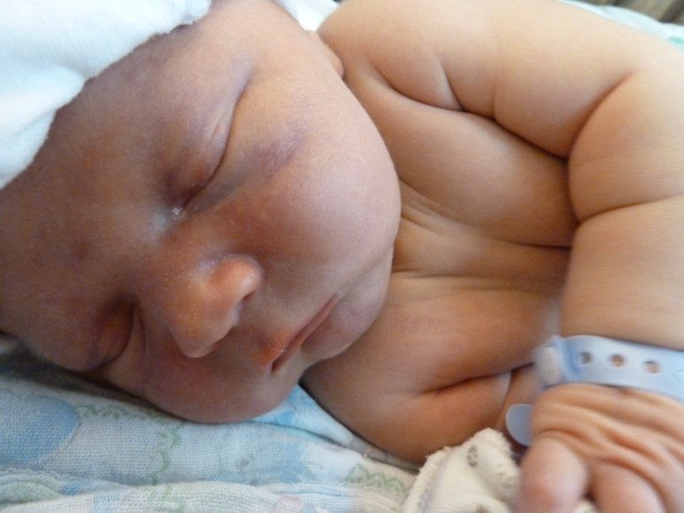 Ну и я начала работать. Тужиться как при запоре на схватках без потуг…уже получалось гораздо лучше, чем в первые разы, я уже чувствовала, что что-то движется там. И в один прекрасный момент..в одну замечательную схватку вдруг чувтсвую я, что уже все, что-то натянуло мне там все, смотрю в отражение в окне (уже было довольно таки темно), а у меня макушка торчит уже!!! Вот так в гордом одиночестве я начала рожать )) Повезло, что в этот момент зашла какая-то акушерка к другой роженице, я сказала, что у меня уже вот, поглядите-ка (схватка отпустила и я была вполне вменяема и почему-то было совсем не страшно), акушерка поглядела))) и начала собираться одеваться (шапочку, перчатки), звать всех, пришла бригада, тоже поглядели))) обрадовались, что наконец -то я тут решила разродиться, ну и буквально за пару «потуг» выдавила я своего малыша весом 4370 и ростом 55 см…