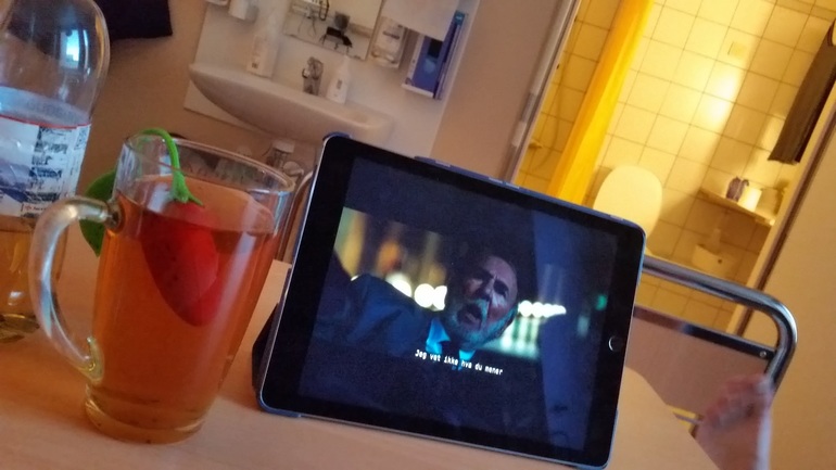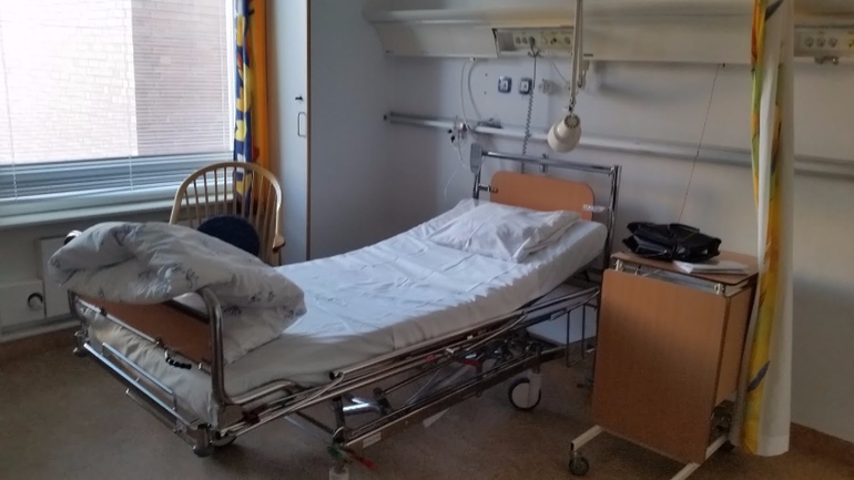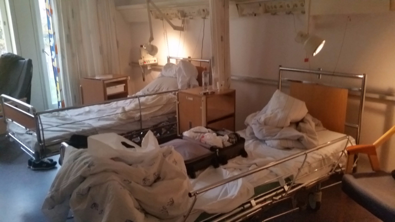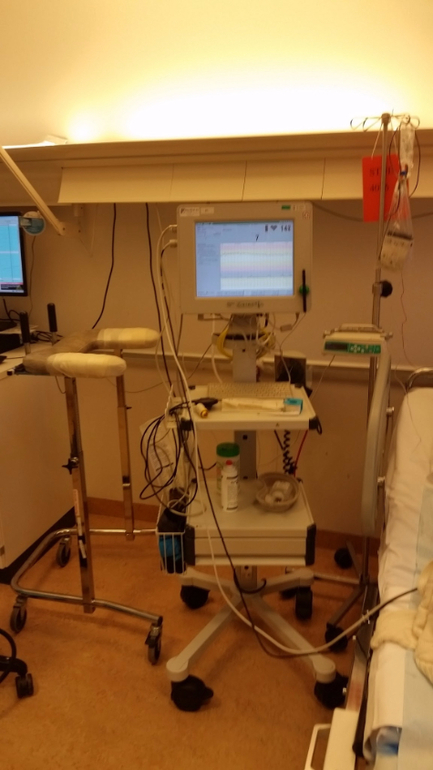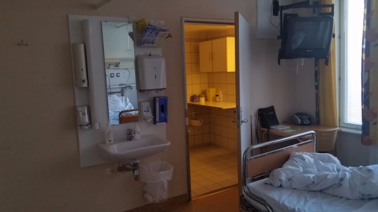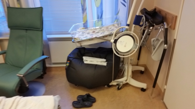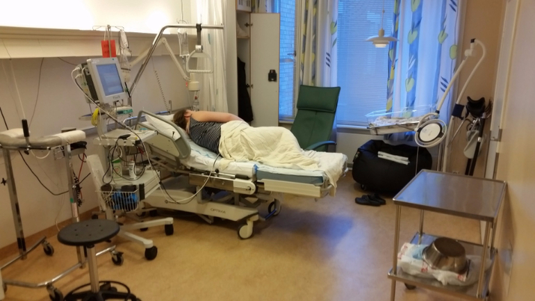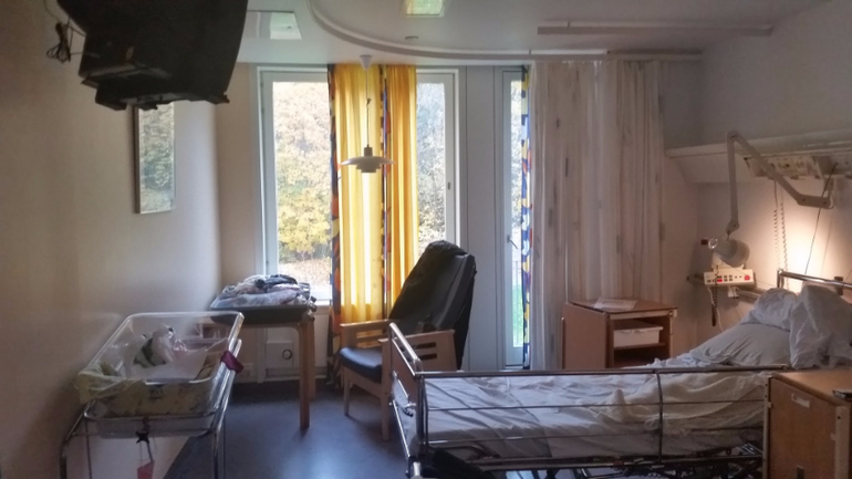 Тем не менее, я до последнего не верила, что мне вот-вот рожать, настолько мне понравилось ходить беременной. "Благодаря" диабету, контроль за мочой/сахаром и акушерка/гинеколог/эндокринолог у меня были каждую вторую неделю, а под конец - каждую неделю (Rikshospitalet, Oslo). Честно говоря, я совершенно не была против, я перестраховщица. Так вот, неделю назад в среду на контроле 40 недели у меня нашли много белка в моче и повышенное давление. Плюс мелкая не выросла с прошлого УЗИ. Гинеколог заявила, что, кажется, шейка мягкая, но преэклампсия начинается, и через 5 дней лучше вызвать роды, если сама не рожу. Я-то, конечно, хотела родить сама, ибо была начитана, что стимулированные роды часто затяжные, схватки больнее и ребенку хуже. Потому на следующий день я, как и полагается, походила интенсивно по лестнице с/на свой 6ой этаж, поубиралась дома и продолжила мужетерапию. Через пару дней в пятницу мне было назначено заехать снова сдать анализы, так, на всякий случай. И опять здрасте-пожалуйста - белок в моче и высокое давление. Акушерка уверенно заявила, что кладут они меня в больницу вот прям щаз, даже не разрешила ехать домой за готовым чемоданом. Вместо этого меня проводили на малоприятную процедуру по вставлению баллона и оценки шейки матки. Я там чуть концы не отдала, как насколько болен был осмотр и с ужасом думала о том, как же я буду рожать. Сам баллон вставить не больно. Он, значит, вставляется в шейку матки и заполняется физраствором (в моем случае 15 мл), от него идет шланг, на который прицепили презерватив и прилепили пластырем к ноге. Я вам скажу, очень странные ощущения. Меня предупредили, что сам баллон роды не стимулирует, а подготавливает шейку матки, там он постоит сутки, подготовит шейку получше, а там они его вынут и введут следующее лекарство. Меня проводили в палату. Обычно палаты двухместные, но мне повезло и одна была свободна. Более того, мое везение этим не ограничилось и муж был постоянно со мной, ему прикатили вторую кровать и мы провели шикарные выходные, как в санатории. Палата в родовом отделении: