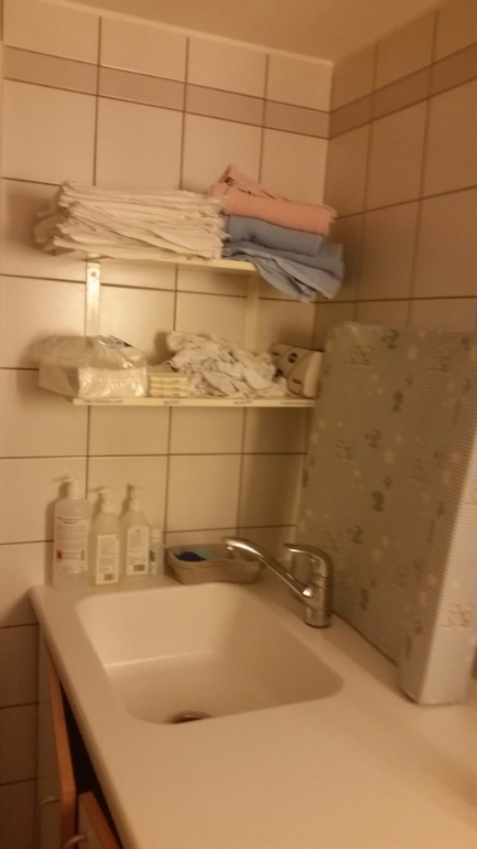 Я же вытужила с помощью акушерки плаценту и меня стали зашивать и приводить в порядок. Разрыв всего один, наружный, 2 степени. Потом, как это принято в стране, нас оставили на час знакомиться с дочкой, которая оказалась 100% копией папы. Через час к нам заглянули с яблочным соком со льдом в высоких фужерах, едой и трогательными национальными флажками. И вообще с тех пор остальной медперсонал сначала считал своим долгом нас сначала поздравить с "подвигом", а уж потом представлялся :))))) Я, поев, соскочила с кровати и сходила в душ, и занялись нашим переводом в послеродовое отделение. Это был один из моих поводов для беспокойства - я знала, что палаты двухместные, а мне так хотелось остаться с мужем. Моя фантастическая удача не покинула нас и на этот раз - все 3 ночи он оставался со мной просто потому, что у отделения была такая возможность. Хотя нас по-честному предупреждали, что его могут выгнать в любой момент при наплыве. Вот палата - прошу прощения за бардак, фотографировала уже при выписке: