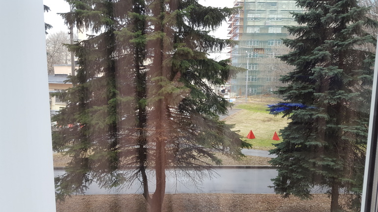 На фото родблок и послеродовая одноместная палата. Вид из окна палаты на елочки.