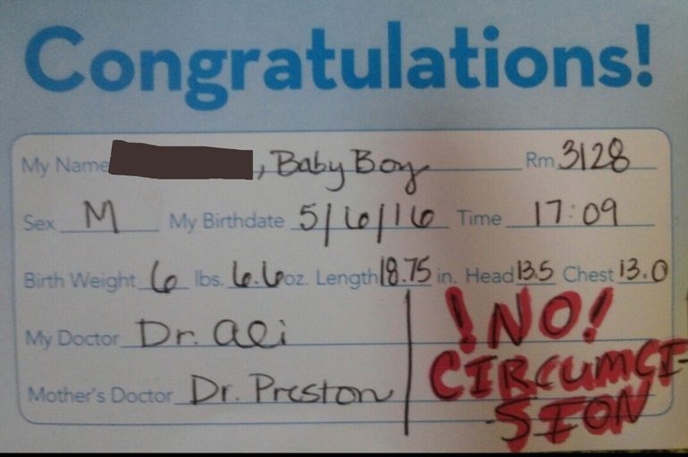 Мы оба были злы и разочарованы. Со старшим сыном у нас не было подобных казусов. Я взяла карточку сыночка, которая была в его передвижной кроватке, и написала красным маркером "Do NOT circumcise!". И после уже, когда его забирали на процедуры, ходила хвостом и ждала снаружи, глядя в окошко Nursery (комната, куда увозят малышей на процедуры), что ему там делают. Кстати, когда у него брали кровь из пяточки, можно было увидеть, как он кричит, но звук не проходил наружу...