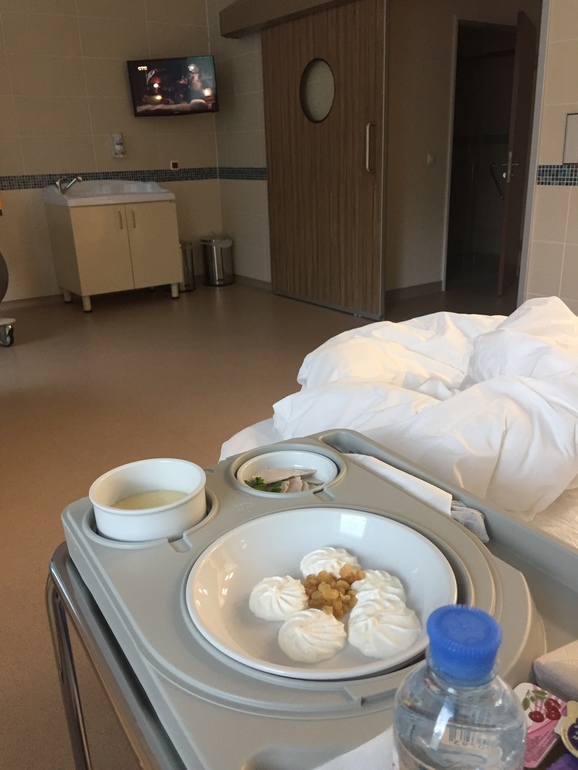 Ну после прокола начало так потягивать, а я кушать жуть хочу) Меня будто услышали и прикатили завтрак) Поела , включила "Орел и решку" и начала нахаживать с перерывами на КТГ)