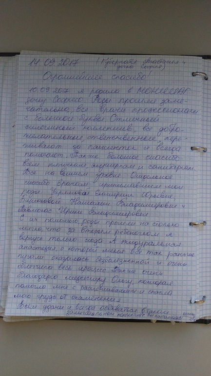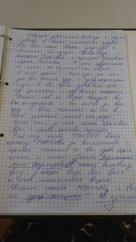 МоскваПланово положили 21.09. Сразу взяли все анализы, УЗИ, осмотр и т.д. Вообще, второй раз убедилась, что там самые лучшие спецы и так следить и обследовать не будут больше нигде. причем, отношение ко всем одинаковое, там нет контрактов, но персонал настолько доброжелательный и внимательный, от санитарок до врачей профессорского уровня. В общем , поставили мне на очередном узи вес сына 4500,-4700. Вот тут я испугалась)))собрали консилиум, меряли меня вдоль и поперек)решили быть ЕР. Я ужас как не хотела КС. Если что, я была уверена, что экс сделают в любой момент, если врачам что то не понравится. Там я чувствовала себя в надежных руках. Ждали мы ждали, и вот 2 октября все произошло. Роды начались в 8 утра, родила я в 16 40. Почти все время в палату кто-то заходил, врачи, акушерка...не оставляли меня. Все помогали, поддерживали. И все получилось. Родился наш Мишка 4420 и 54 см. Первым делом весь персонал хотел узнать вес,))))хорошо, что узи чуть ошиблось в мою пользу)))родила сама, без разрывов, у сына было тройное обвитие, два на шее и одно на плечах. Поставили нам 8/9 по Апгар. Своему врачу я ставлю за роды пятерку) пс есть книга отзывов там, вот сфоткала несколько. Один из них писала моя сестра)