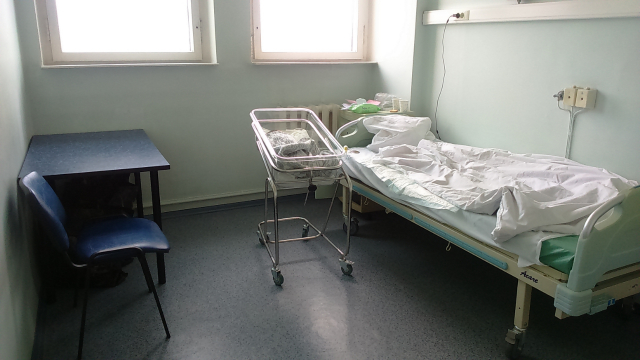 Послеродовя палата рассчитана на одну маму и её ребёнка (или детей). В палате есть кровать для мамы, кроватка для малыша, раковина, пеленальный столик, тумбочка, стол и стул. В каждом боксе две такие палаты. На каждый бокс приходится душ (квадратный поддон, душ и шторка) с раковиной + туалет с раковиной. Обратите внимание, что в палате нет штор, поэтому будьте готовы к тому, что днём от солнца (если оно будет) некуда будет деться.