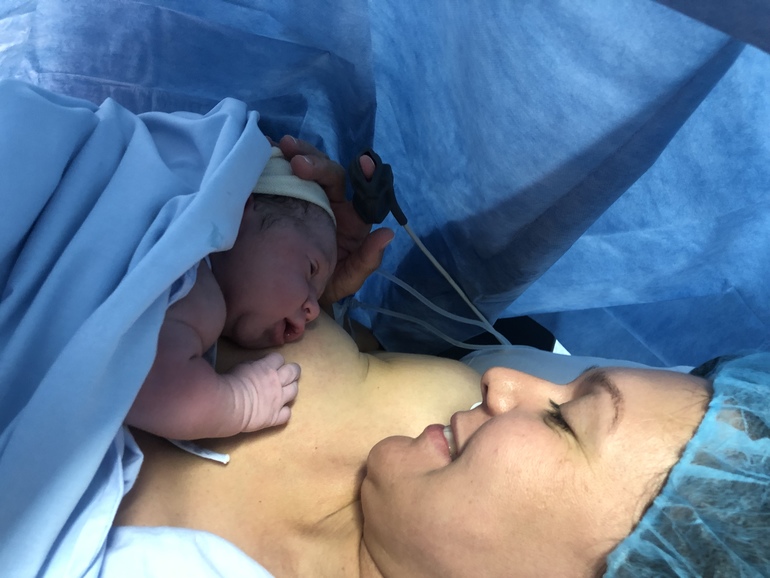 Когда делали операцию,я ничего не чувствовала,только почувствовала,как сильно тянут что-то у меня внутри.И сразу услышала громкий крик Ваньки и восторженные возгласы врачей:о!какой красивый,какой хороший!Сына обтерли,надели на него смешную шапочку и сразу же положили мне на грудь.Акушерка взяла мой телефон и сделала несколько снимков на память.Малыш начал лихорадочно елозить носиком пока не нашёл сосок и не присосался,чем привёл в восторг весь медперсонал.У меня на глаза навернулись слёзы.Я вспомнила,что своего старшего сына я увидела через 8 часов после рождения.И какие это были мучительные 8 часов.А Ванек смотрел на меня своими голубыми глазами.Как будто все знал:мама моя,сися моя,я сейчас буду обедать).Затем нас повезли в палату ,где уже ждали муж и сын.По дороге все,кто меня встречал сердечно поздравляли и говорили комплименты малышу.