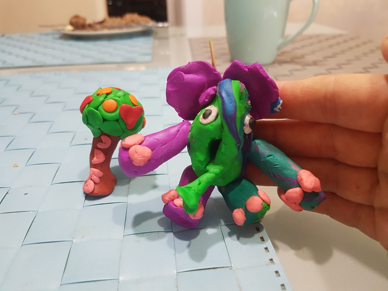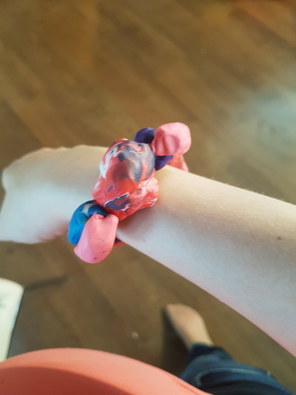 6 мая я проснулась с ноющей болью как при месячных, которая уже была раньше периодически, но я уже не обращала внимания и все ждала классических схваток, как в предыдущие разы. Мама меня настращала, что третьи роды могут быть совсем другими и уговорила подъехать показаться врачу. Врач прииистально меня посмотрела, сказала, что 3-4 см открытие, и плосковатый пузырь (опять!!!!). Что ребенок уже очень низко, и лучше роды немного запустить гелем, ибо пузырь сдерживает родовую деятельность, а ходить долго с моим суженным тазом тоже не очень хорошо. Предложила утром лечь. Я приуныла, так хотела естественные роды, но согласилась. Забрал меня муж, и я позвала его заехать в кафешку попить кофеек - в последний раз. К этому моменту ноющая боль усилилась в разы, и я чувствовала, что начинаю рожать. Приехав домой, мы как психи начали доделывать дела: я кинула стирку детскую, поставила варить суп и…. стала крутить фарш на котлеты! В прошлый раз я не успела их дожарить и в тот момент мне почему-то стало очень важно это сделать! Схватки приобрели более четкий характер, но они были просто ноющей болью, а не четкими волнами, как раньше! После котлет мы сказали детям, что мама сейчас будет собираться в роддом. Дочка очень заволновалась и позвала нас всей семьей полепить пластилином)))) Позвонив маме и врачу, что схватки с интервалом 10 -11 минут, мы сели медитативно лепить. На фото браслет от сына на память.