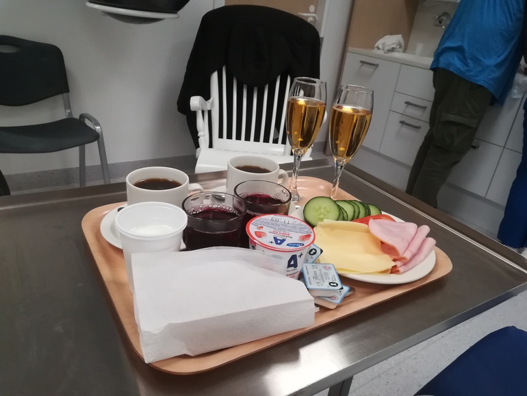 Дочку накрыли одноразовой пеленкой и положили мне на грудь, а сами занимались осмотром, приводили место действий в порядок и заполняли бумаги. Муж стоял рядом с нами, смотрел на дочку и умилялся. Потом малышку приложили к груди, потом ее ополоснули от какашек (хотя сейчас у нас детей после родов не моют и оставляют в смазке, только нос и глаза протирают), измерили, а после муж переоделся в больничную рубашку и получил дочку себе на грудь. Позже нас ждал праздничный завтрак, а меня ещё и душ🙂 В родовой мы провели ещё около пяти часов, ожидая окончательных осмотров и перевода нас в послеродовую гостиницу.