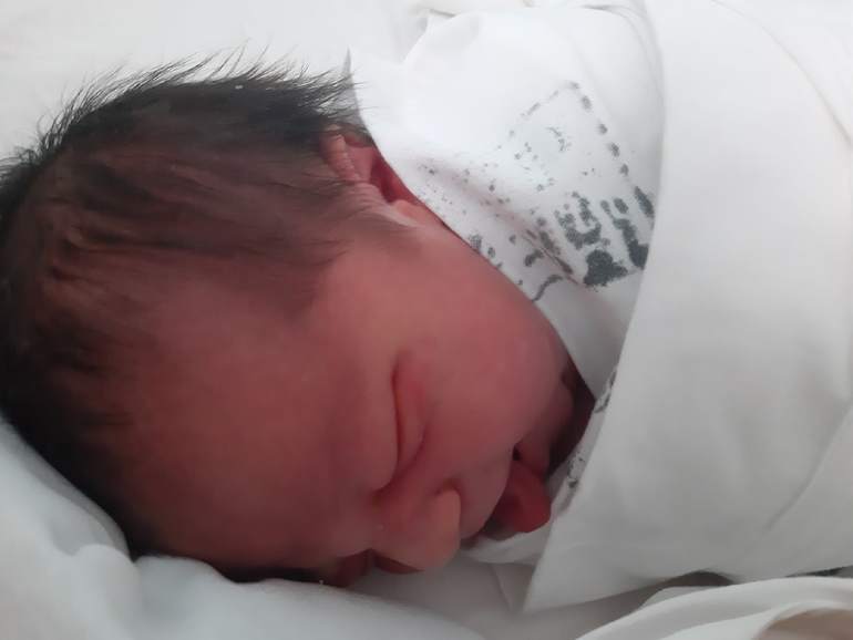 Показалась головка вместе с правой рукой (до сих пор любит так спать, правая ручка подпирает щечку).Когда попросили не тужиться, я опять не смогла контролировать себя.и что-то сделала не так точно.