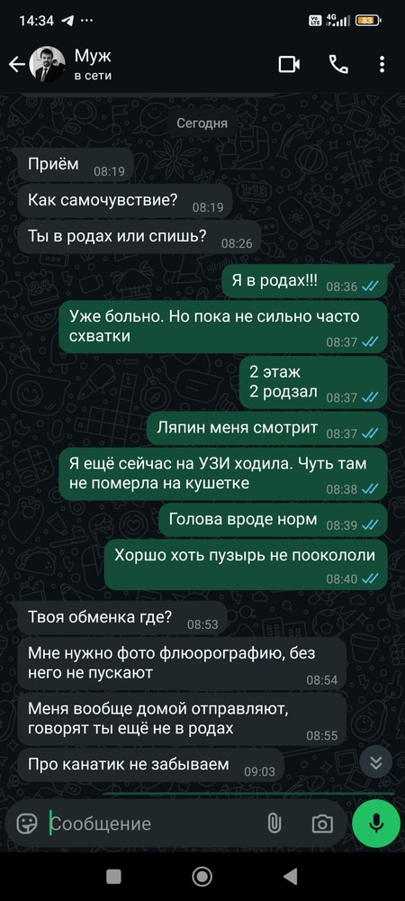 После УЗИ я пыталась прохаживать схватки, думала, что будет легче, но нет, легче мне было лежать на левом боку и дышать как учил А. Кобаса. Через какое-то время в животе почувствовался щелчок, было неприятно, я бы даже сказала болезненно, и из меня полилось. Позвала акушерку, мою тёзку, как оказалось, и сказала про воды. Мы их посмотрели, они какие-то были странные, но не зелёные, а коричневатые что ли. Я думаю, что может это примеси крови или пробки (которую я тоже в эти роды не видела!). Пока стояла и ждала смену пеленок, показалось, что тужит! Ляпин посмотрел открытие: 5 см! Опять подключили к ктг, чтобы наблюдать за малышом. Я думала, что сейчас начнётся жаришка, но нет, всё происходило постепенно и нарастающе по ощущениям, но промежуток был нормальный, терпимо. Муж должен был быть, со мной на родах, но он, сначала дочку отвозил на тренировку, потом приехал и протупил с флюорографией, не нашёл её в документах, поехал в свою поликлинику за новой фишкой. Пока стоял в очереди - нашёл флюорографию в документах 😅 А меня уже накрывало конкретно и мне было пофиг: есть со мной муж или нет его, я даже настроилась рожать без него. Но он пришёл в самый жескач, когда я уже говорить не могу и мечтаю уже родить наконец!