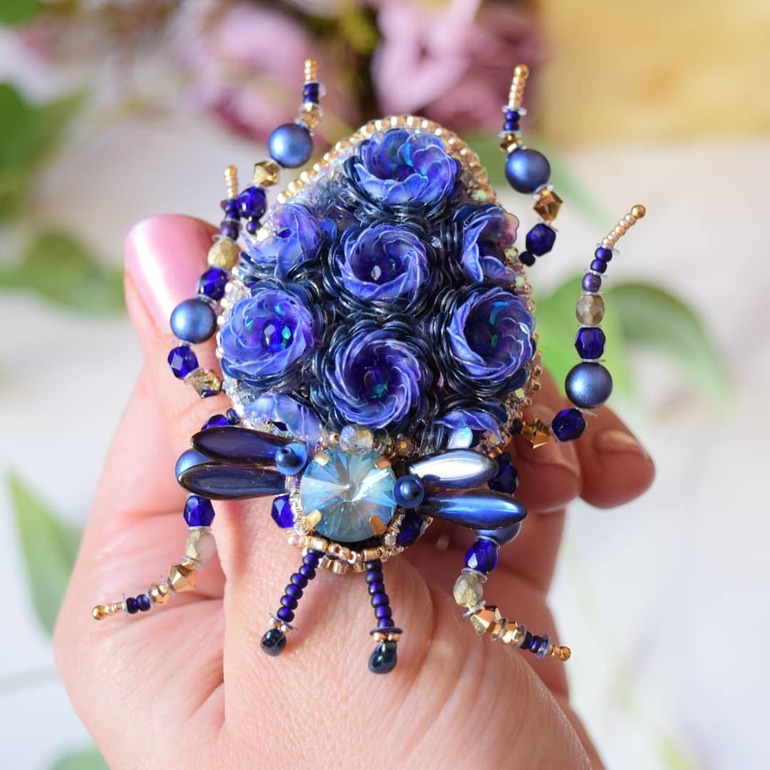 Есть у меня брошь-синий жук. А у мамы зеленый. Захотелось с ней ими поменяться, решила со своим в последний раз в свет выйти, и так жалко его отдавать стало) Я его купила у другого мастера и с этого началось мое увлечение брошами. Но мама же уже ждет синего жука. Пришлось сделать ей в спешном порядке) Вот что вышло: