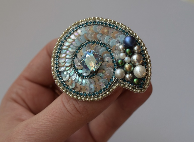 Девушка заказала броши подругам к 8 марта. Дизайн и цветовую гамму выбрала она. Вообще согласовывали почти все, это для меня было очень непривычно) Зато она получила, что хотела и осталась довольна. Итак, брошь-ракушка стала моей фавориткой. Очень деликатное мерцание кристалла, жемчуга и пайеток. Кстати, вы видите, что использованно 4 цвета пайеток?