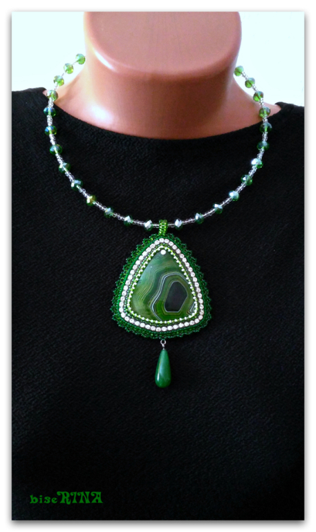 Материалы: агат, бисер чех и япония, стразовая лента, бусины хрустальные, подвеска - нефритовая капелька, фурнитура. Окружность - 48 см.