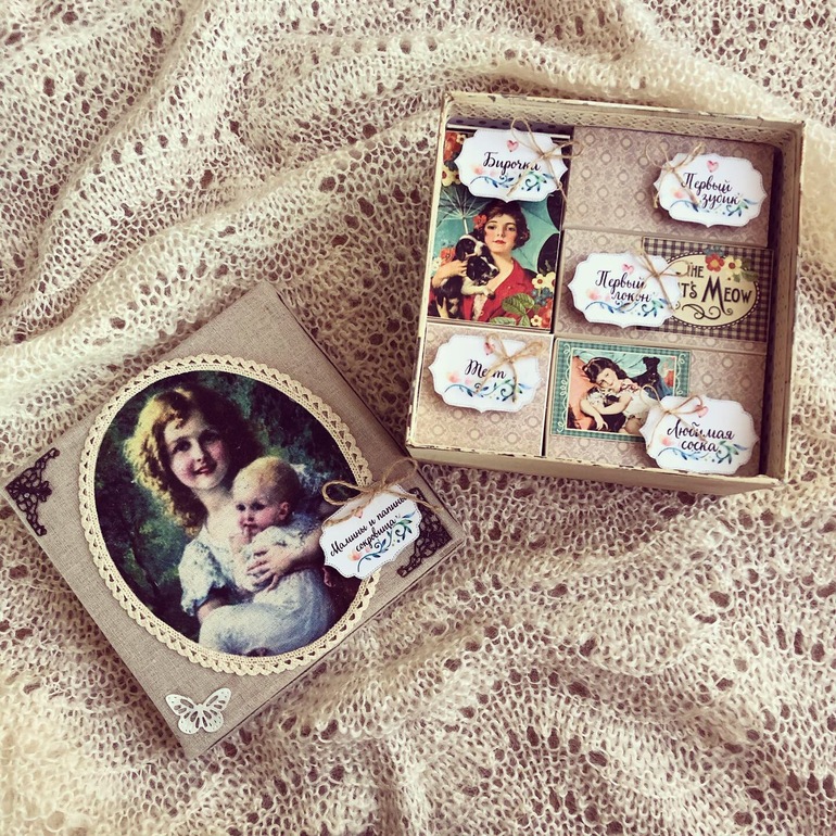 внутри 3 коробочки, рамка для первого фото и мини-альбомчик для первых фото