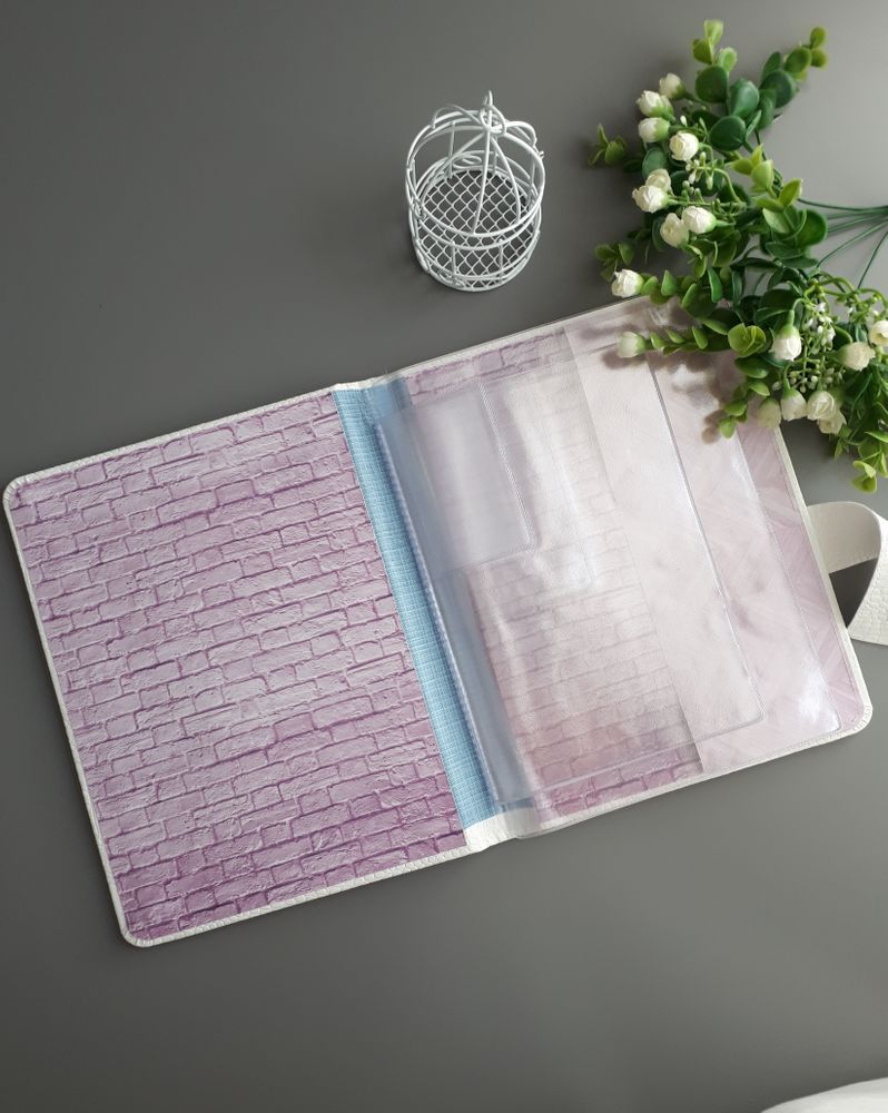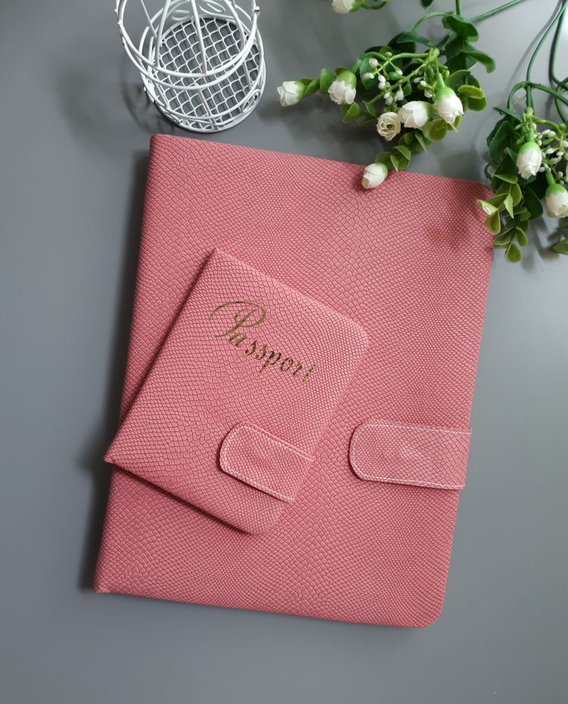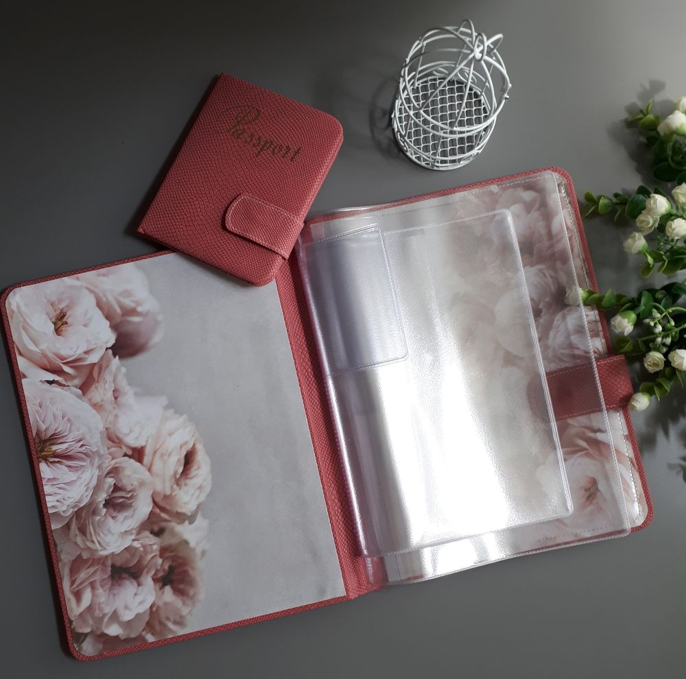 Обложка выполнена из итальянского кожзама, застежка-магнитная кнопка, внутри плотные пластиковые вкладыши для документов (на 2 и 3 комплекта).