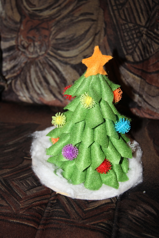 Сделала елочку в садик из фетра, на клеевой пистолет клеила. Доча крутилась рядом, играла фетром и развешивала шары.