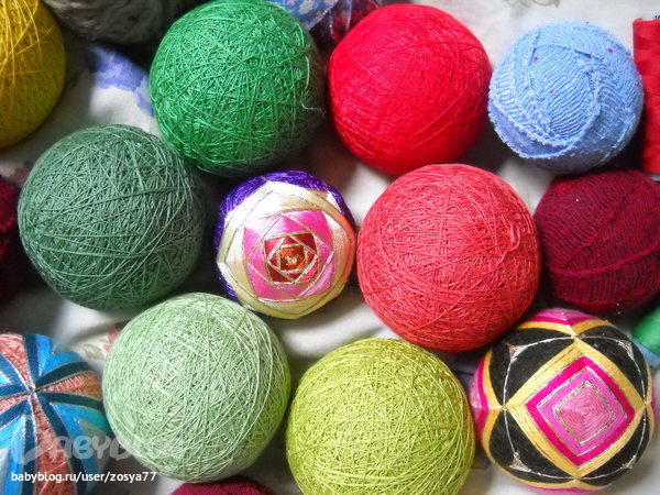 Вот так выглядят заготовки для моих темари. Сначала сматываю клубки из старья, потом ненужная пряжа, потом нить-основа для фона