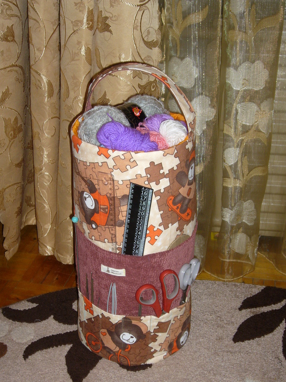 Сшила вот такой ,даже не короб,наверное,а ведро текстильное.Достаточно высокое и вместительное,у меня туда вошла вся пряжа,какая у меня была,собственно для этой цели и было сшито это ведро.Сбоку имеется множество кармашков ,чтобы поместить туда спицы,ножницы и все ,все,все что может пригодиться для вязания.