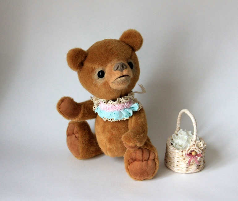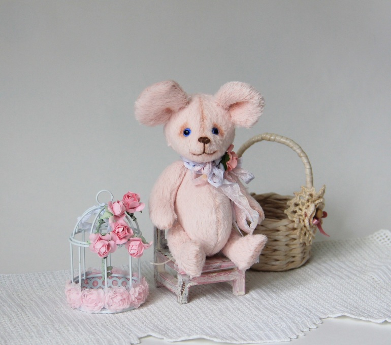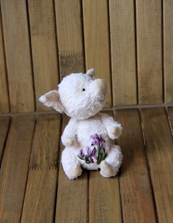 Поросена Тедди с вышитыми на брюшке ирисами - очень нежная и трогательная девочка. Она сшита из немецкой вискозы ручного крашения, декорирована шелковыми лентами. Любит сидеть и крутить головой, умеет валяться и стоит с опорой.