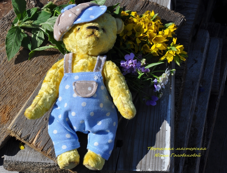 Плюшевый мишка тедди Желток. Сшит полностью вручную из плюша СССР. Рост 21, 5 см. Руки, ноги, голова крутятся. Голова покачивается. Набит древесными опилками и лавандой, вкусно пахнет лавандой и деревом. Одет в комбез и кепочку из натурального льна. Приглашаю к просмотру, много фото