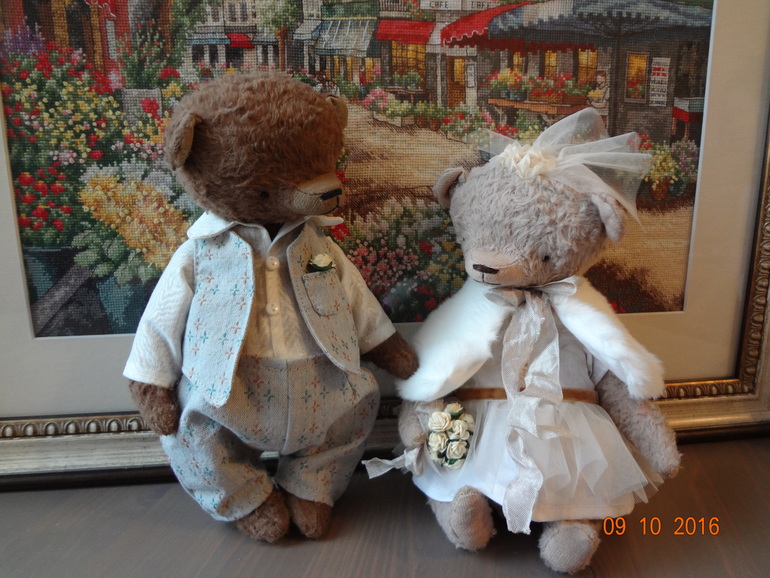 .Мишки сшиты полностью вручную из вискозы ручного окраса. Внутри опилки и металлический гранулят. 6 шплинтов,голова покачивается.Стеклянные глазки. Невеста одета в платье,сзади на кнопочке,сверху меховая накидка. Жених одет в белую рубашку и брюки с жилеткой.