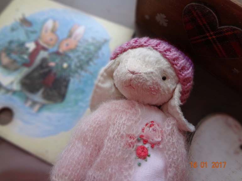 Зайка тедди сшита из белоснежной немецкой вискозы,слегка тонирована художественными красками. Шплинтовое крепление,голова покачивается.Внутри опилки и стеклянный гранулят. Одета зайка в платье из японского хлопка с вышивкой,сзади на кнопочках,воздушную кофточку из кид-мохера и теплую шапочку.Зайка получилась очень нежной и милой. Сшита с большой любовью и теплом.