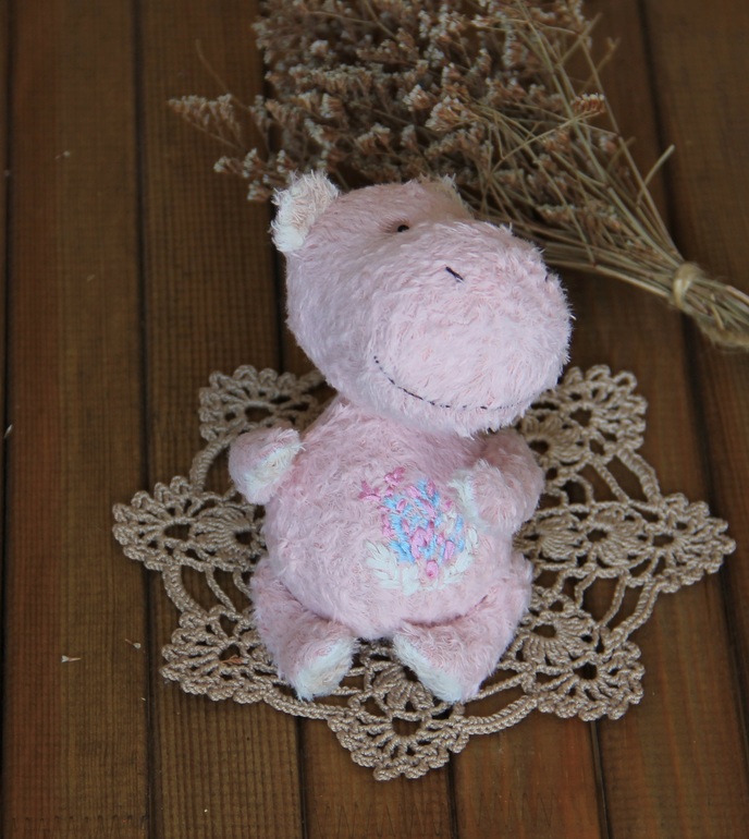 Теперь живет у меня такой друг, из нежно-розовой вискозы, опилочный бегемот с вышивкой на пузе.