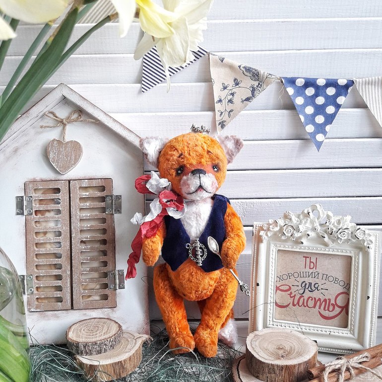 Лисик ростом 17 см, тело цельнокроенное, шплинт лишь в голове. Сшит из вискозы ручного окраса полностью вручную. Очень нежный и добрый, а еще у него мягкое упругое пузо - очень понравилось его тискать)